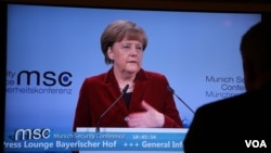 خانم مرکل صبح شنبه هفتم فوریه در این کنفرانس در سخنانی با اشاره به تلاشهای آلمان و فرانسه برای برقراری صلح در اکراین گفت که هنوز مشخص نیست که این تلاشها موفقيتآميز باشد و گفت: «من و رئيس جمهوری فرانسه فكر ميكنیم ارزش امتحان كردن دارد و آن را به مردم اكراين مديونيم».