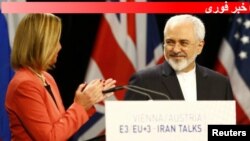 محمد جواد ظریف و فدریکا موگرینی در نشست خبری بیانیه مشترک شان را می خوانند.