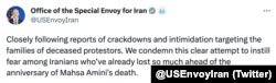 دفتر آبرام پیلی، جانشین فرستاده ویژه آمریکا در امور ایران با اشاره به اخبار منتشر شده از بازداشت و فشار به خانوادههای قربانیان جمهوری اسلامی، «تلاش آشکار برای ایجاد ترس در بین ایرانیان مخالف» را محکوم کرد.
