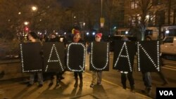 تظاهرکنندگان پلاکاردهایی در دست داشتند که حروف نام لاکوان مک دونالد، نوجوان سیاهپوستی بر آن نقش بسته بود که جیسون وَن دایک، پلیس سفیدپوست شیکاگو در ماه اکتبر سال ۲۰۱۴ میلادی با شلیک شانزده گلوله در ظرف سی ثانیه او را به قتل رساند.