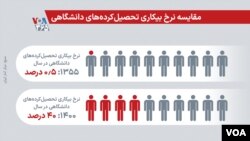 دادههای مرکز آمار ایران نشان میدهد نرخ بیکاری تحصیلکردههای دانشگاهی در سال ۱۳۵۵، نیم درصد برآورد شده است که امروز این رقم به ۴۰ درصد رسیده است.