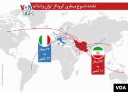 ✅ اینفوگرافیک | نقشه شیوع بیماری کرونا از ایران و ایتالیا: ۱۱ کشور توسط ۹۷ بیمار از ایران آلوده شدند