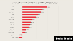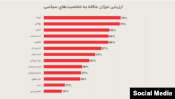 بر اساس نمودار "میزان خالص علاقمندی"، ظریف با ۶۹ درصد محبوب ترین سیاستمدار ایرانی است و پس از او، روحانی، حسن خمینی، خاتمی و هاشمی رفسنجانی بیشترین محبوبیت را دارند. نکته جالب توجه آن است که جنتی و مصباح این بار با نمرات منفی در انتهای جدول علاقمندی مردم به سیاستمداران ایرانی قرار گرفته اند؛ احمد جنتی، رئیس جدید مجلس خبرگان نمره منفی ۱۰ و مصباح یزدی نمره منفی دو را به دست آورده است.