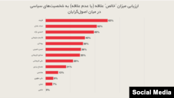 بر اساس این نتایج، احمدی نژاد با ۳۹، علی لاریجانی با ۳۴ و احمد جنتی با ۳۱ درصد در بالای جدول سیاستمدارانی هستند که ایرانیان علاقه ای به آنها ندارند و محمد جواد ظریف و قاسم سلیمانی با ۷ و ۱۱ درصد هم کمترین آرای عدم محبوبیت را گرفته اند و در انتهای این جدول قرار گرفتند.