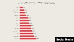 نتیجه دیگری که از نظرسنجی آی پز درباره سیاستمداران برجسته ایران به دست آمده است، نمودار نبود علاقمندی به سیاستمداران است.