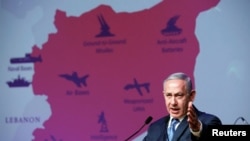 نخستوزیر اسرائیل در بخشی از سخنان خود اشاره کرده است که ارتش اسرائیل «تنها نیروی نظامی در جهان است که به طور مستقیم با نیروی نظامی ایران مواجه شده است.» اشاره او به درگیریهای رخ داده در سوریه میان ارتش اسرائیل و نظامیان ایرانی حاضر در جنگ سوریه است. به گفته او «ما در سوریه با ایران مواجه شدیم و هر جای دیگری که لازم باشد از خودمان دفاع کنیم با ایران مواجه خواهیم شد.»