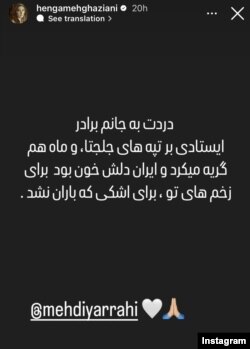 هنگامه قاضیانی، بازیگر، در استوری اینستاگرام، نوشت: «دردت به جانم برادر، ایستادی بر تپههای جلجتا، و ماه هم گریه میکرد و ایران دلش خون بود برای زخمهای تو، برای اشکی که باران نشد.»