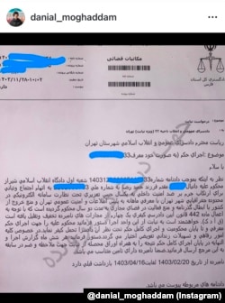 او همراه با انتشار تصویر ابلاغ اجرای حکم، نوشت: «این نامه اعمال بنده، دانیال مقدم است، به جرم عشق به هنر و وطن باید یک سال حکم پابنده سامانه الکتریکی را تحمل کنم.»