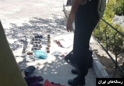 تصویر تجهیزات یکی از مهاجمان به آرامگاه آیت الله خمینی که توسط خبرگزاری های ایران منتشر شد. او هشت نارنجک دستی و پنج خشاب دوتایی و یک اسلحه کلاشنیکف در اختیار داشته است.