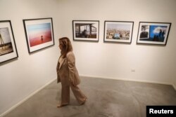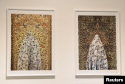 به گزارش رویترز، تصویر زنی با چادر سفید با نقش و نگاری آراسته که مقابل یک قالیچه ایرانی آویزان ایستاده است، شاید چشمگیرترین عکس این نمایشگاه باشد. این تصویر از پشت زن گرفته شده و نقش چادرش که کاملا او را میپوشاند، با طرح گلدار متراکم قالی درهم آمیخته است.