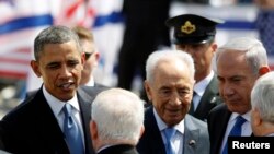 شیمون پرز، رئیس جمهوری، و بنیامین نتانیاهو، نخست وزیر اسرائیل از آقای اوباما در فرودگاه بن گورین تل اویو استقبال کردند.