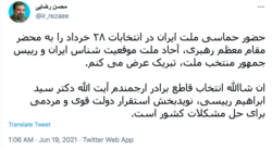 محسن رضایی هم صبح شنبه در یک پیام در توئیتر منتسب به او، «حضور حماسی ملت ایران» را به رهبر جمهوری اسلامی و «رئیس جمهوری منتخب تبریک گفت و نوشت: «ان شاالله انتخاب قاطع برادر ارجمندم آیت الله دکتر سید ابراهیم رییسی، نویدبخش استقرار دولت قوی و مردمی برای حل مشکلات کشور است.»