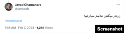 جواد چمنآرا، از کاربران ایکس، سخنان او درباره سرنگونسازی هواپیمای مسافربری اوکراینی با موشکهای سپاه پاسداران و مخفیکاری جمهوری اسلامی را تکرار کرد و نوشت: «زودتر میگفتید علاجش میکردیم!»