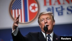 پرزیدنت ترامپ در بخش دیگری از این کنفرانس خبری گفت که کره شمالی خواستار لغو تحریمهای بینالمللی همزمان با آغاز برنامه خلع سلاح اتمی شده بود که این از نظر آمریکا قابل پذیرش نیست.