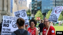 این معترضان می گویند چون هیلاری کلینتون به جنگ در عراق و سوریه و لیبی رای داده و موافق بوده، رئیس جمهوری خوبی نیست.