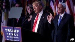 دونالد ترامپ و مایک پنس در جمع هواداران خود حاضر شده و رسما پیروزی آقای ترامپ را در انتخابات ریاست جمهوری آمریکا اعلام کردند. آقای ترامپ گفت که هیلاری کلینتون در تماسی تلفنی به او تبریک گفته است.