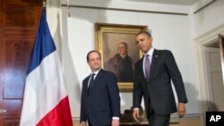 باراک اوباما رئیس جمهوری آمریکا روز سه شنبه از فرانسوا اولاند رئیس جمهوری فرانسه در محوطه جنوبی چمن کاخ سفید استقبال کرد، آنها سپس برای گفت و گو به داخل کاخ رفتند.