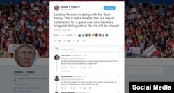 دونالد ترامپ، روز چهارشنبه با انتشار توییتی گفت چشم انتظار این است که در کنار خانواده بوش باشد. رئیس جمهوری آمریکا گفت: «این یک مراسم ترحیم نیست، این روز تجلیل از مردی بزرگ است که یک زندگی طولانی و ممتازی داشت. جای او خالی خواهد بود.
