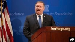 آقای پمپئو صبح دوشنبه ۳۱ اردیبهشت در بنیاد هریتیج در سخنرانی خود با عنوان «پس از توافق: یک راهبرد تازه در مورد ایران»، در چهار حوزه سخنرانی کرد. او اول گفت که فشارمالی بیسابقه بر حکومت ایران اعمال خواهد شد. دوم او گفت بین وزارت خارجه و وزارت دفاع آمریکا برای مقابله با هرگونه تجاوزگری ایران همکاری نزدیکی خواهد بود. سوم او از مردم ایران حمایت مشخصی کرد و در نهایت گفت آمریکا حاضر به مذاکره با ایران برای از سرگیری روابط دیپلماتیک و برابر در صورت تغییر رفتار جمهوری اسلامی است.