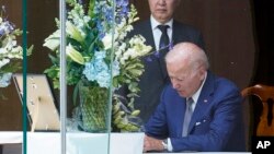 همچنین بایدن در جریان بازدید روز جمعه از اقامتگاه سفیر ژاپن در واشنگتن به شینزوآبه نخست وزیر سابق ژاپن ادای احترام کرد و کتاب یادمان تسلیت مرگ آقای آبه را امضا کرد.